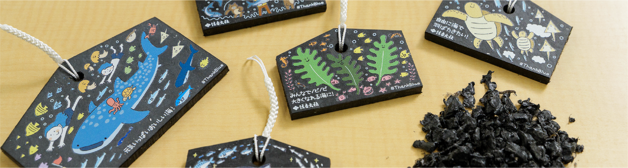 「プラスチックのリサイクル品は世の中に多く出回っていますが、それ自体も使い終わってまたゴミになってしまっては意味がありません。作ったからには捨てられないもの、長く手元に置いてもらえるものが良いとの想いから絵馬へと辿り着きました。そもそも絵馬は自分たちの願いを書くものですが、豊かな海への願いを一番持っているのは海の生き物だと思います。それなら生き物たちの願いも一緒に絵馬に表現することで、生き物の願いと私たち人間の願いが重なる素敵なアイデアを盛り込んでいます」とは株式会社フィッシャーマン・ジャパングループの土合さん。たくさんの魚たちと泳ぐジンベエザメには、「ごみではなく生き物がたくさんいる海で泳ぎたい」という願いが、大きく育つワカメには、「小さな芽のうちに食べられることなく、海の中でのびのび育ちたい」という願いを表現。その他にも乱獲などの水産資源の課題なども含めて、全5種類の絵馬が完成しました。