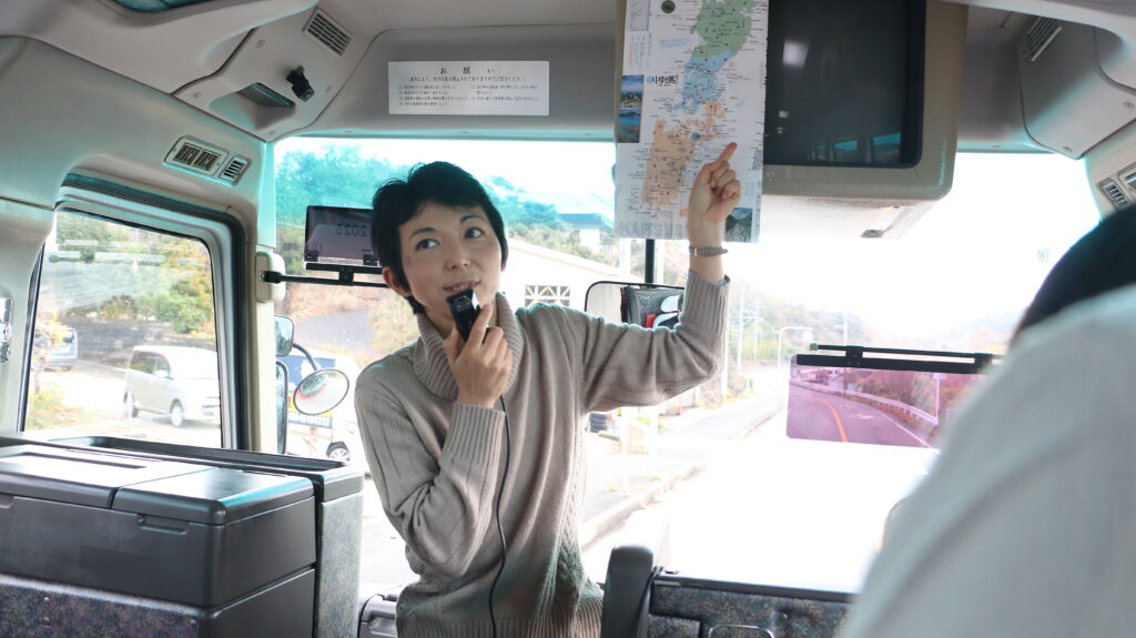 インタープリターを務めたのは、株式会社ブルーオーシャン対馬 代表取締役・川口幹子様。ツアー冒頭では、一般社団法人ブルーオーシャン・イニシアチブを代表して、代表理事を務める代島裕世より挨拶を行いました。