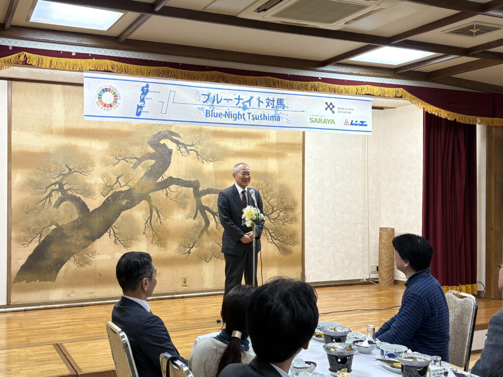 会場では、対馬市市長 比田勝尚喜様からの歓迎のご挨拶に続き、BOI代表理事 代島裕世による乾杯の音頭をもとに、会食を開始。ツアーで見て、聞いて、感じたことを共有しながら、参加者同士、そして対馬の皆さまとの対話が自然と生まれ、立場や分野を超えた交流が広がっていきました。 海洋問題や地域課題について、課題意識だけでなく、それぞれの立場からの考えや可能性を率直に語り合う、有意義な時間となりました。